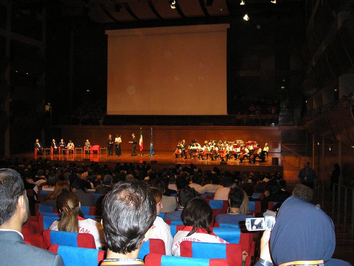 The opening ceremony was a bit hard to follow because the translator speaking English was a bit mumbly. They announce there are a record number of countries competing 146. The famous Italian composer Ennio Morricone (he did "The Good, The Bad and The Ugly") had written some special pieces for the Chess Olympiad and a childrens orchestra performed them. Flags of the competing countries were taken on stage and the name called out, Guernsey got a big cheer and some wooo-ing but that may have mainly come from me. Jersey's flag was missing and they therefore didn't get their name called out, shame.>